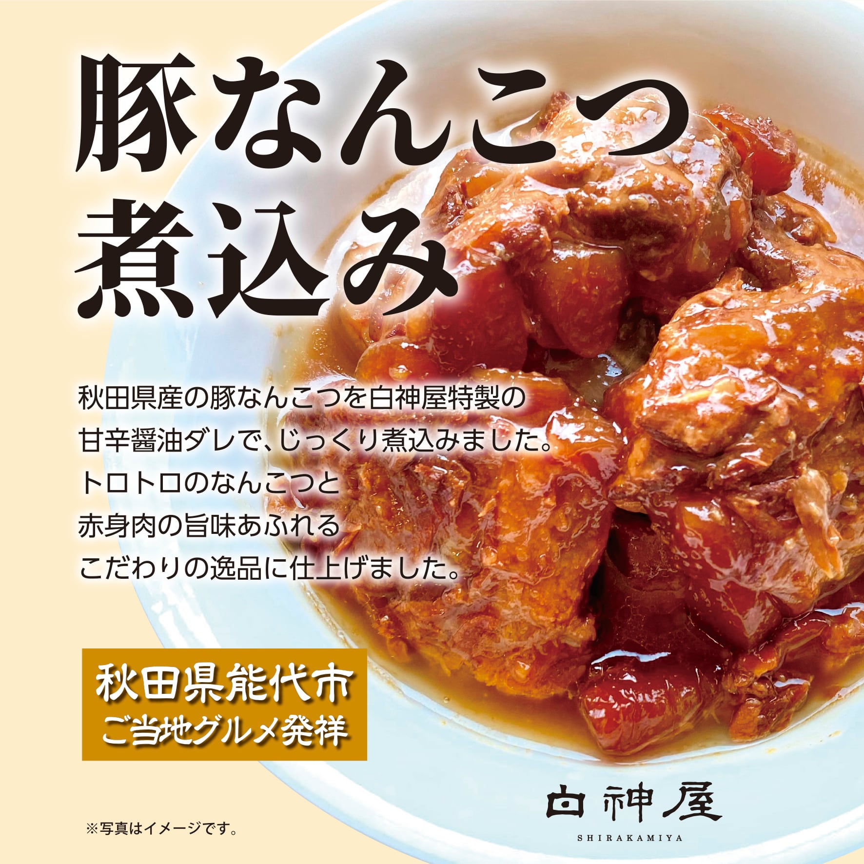 豚なんこつ煮込みは、秋田県産の豚なんこつを白神屋特製の甘辛醤油だれでじっくり煮込みました。トロトロのなんこつと赤身肉の旨味があふれるこだわりの逸品です。