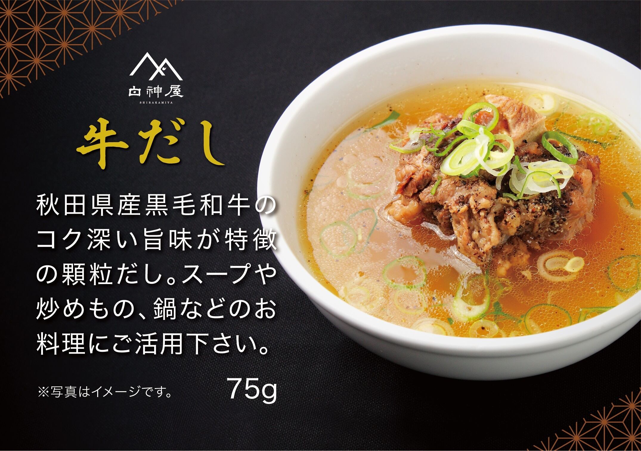 秋田黒毛和牛 牛だしは、秋田牛をベースにした贅沢な牛だしです。秋田牛の特徴である柔らかさと旨味を凝縮し、顆粒状にした使いやすい商品です。